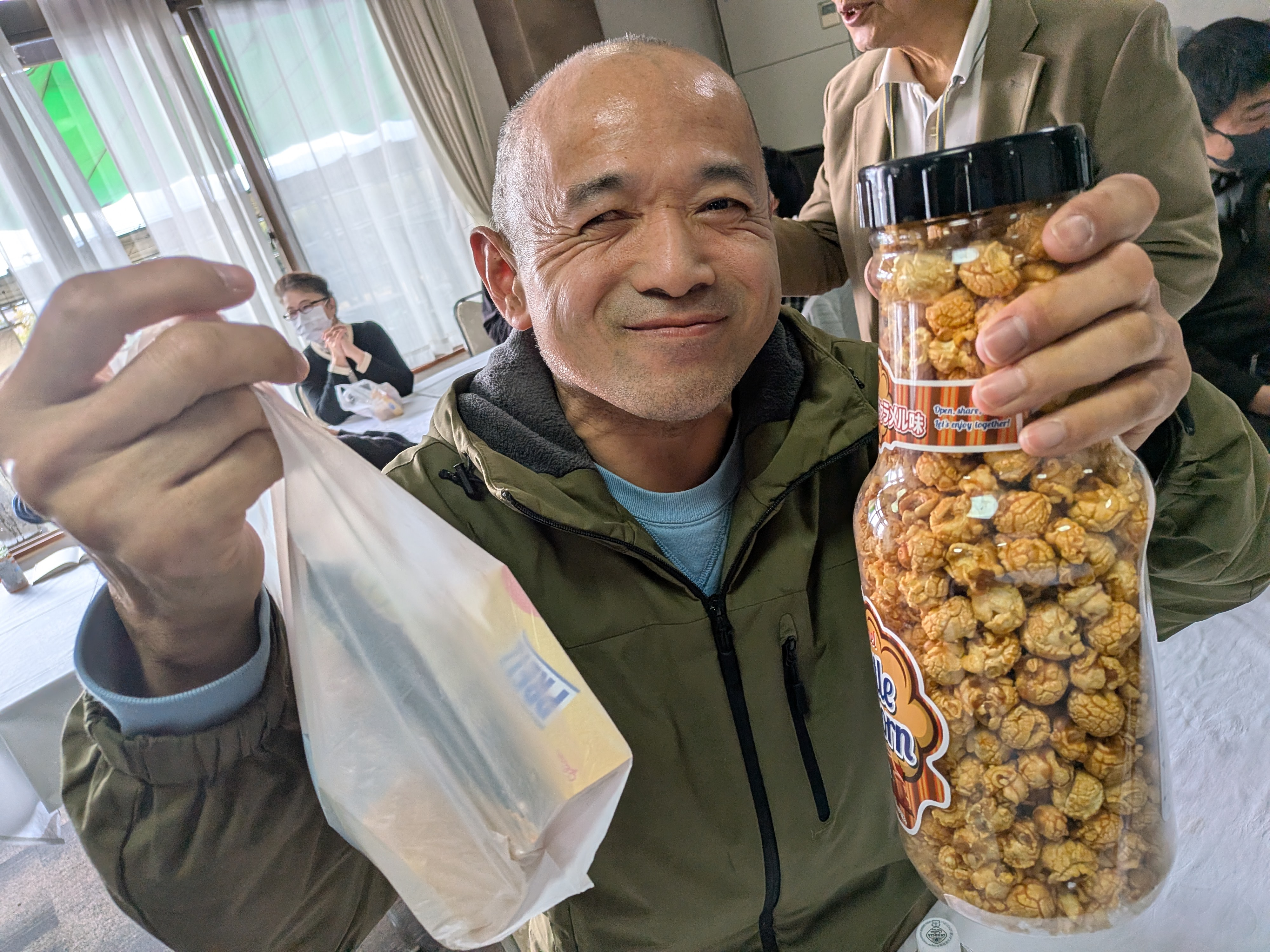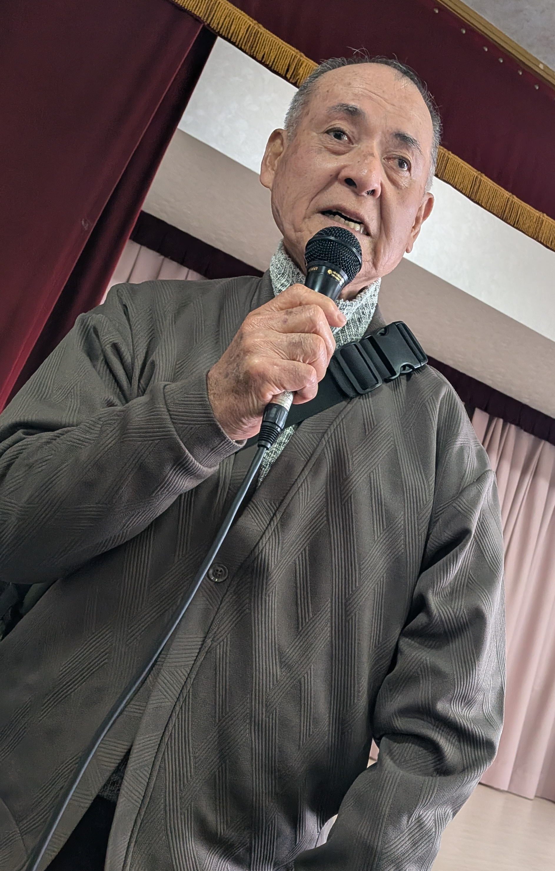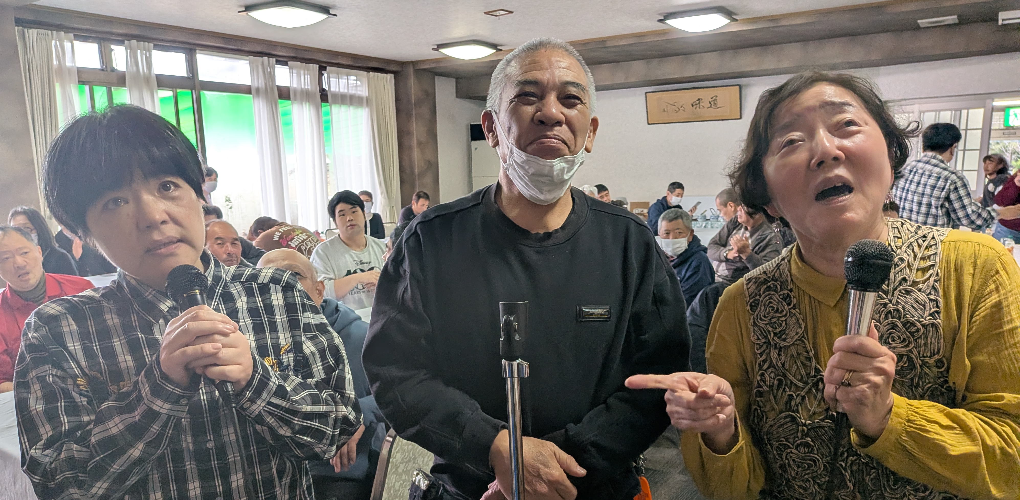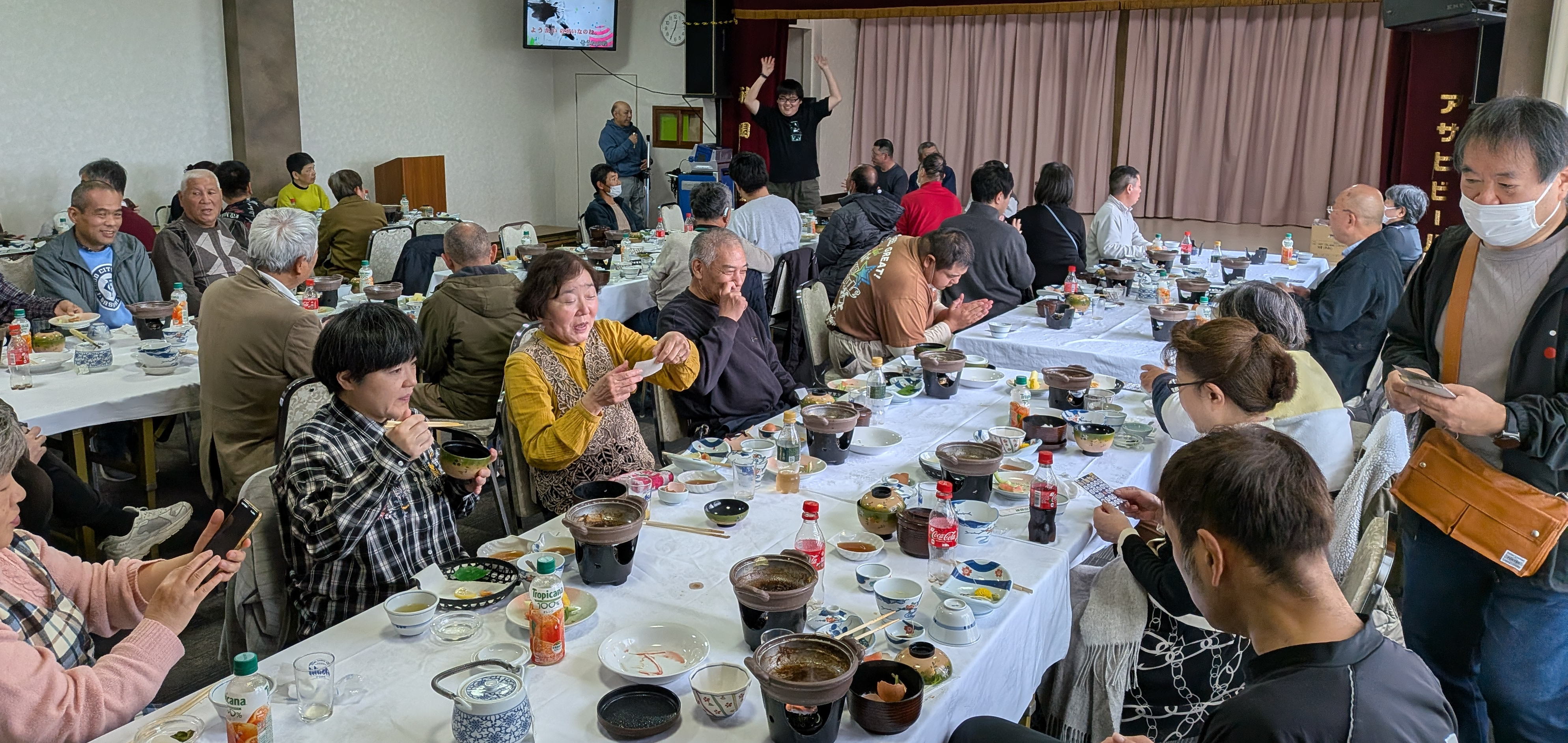 調理に参加しない人たちは音楽室でカラオケをたっぷり楽しみ、その後、大ホールで会食をしました。